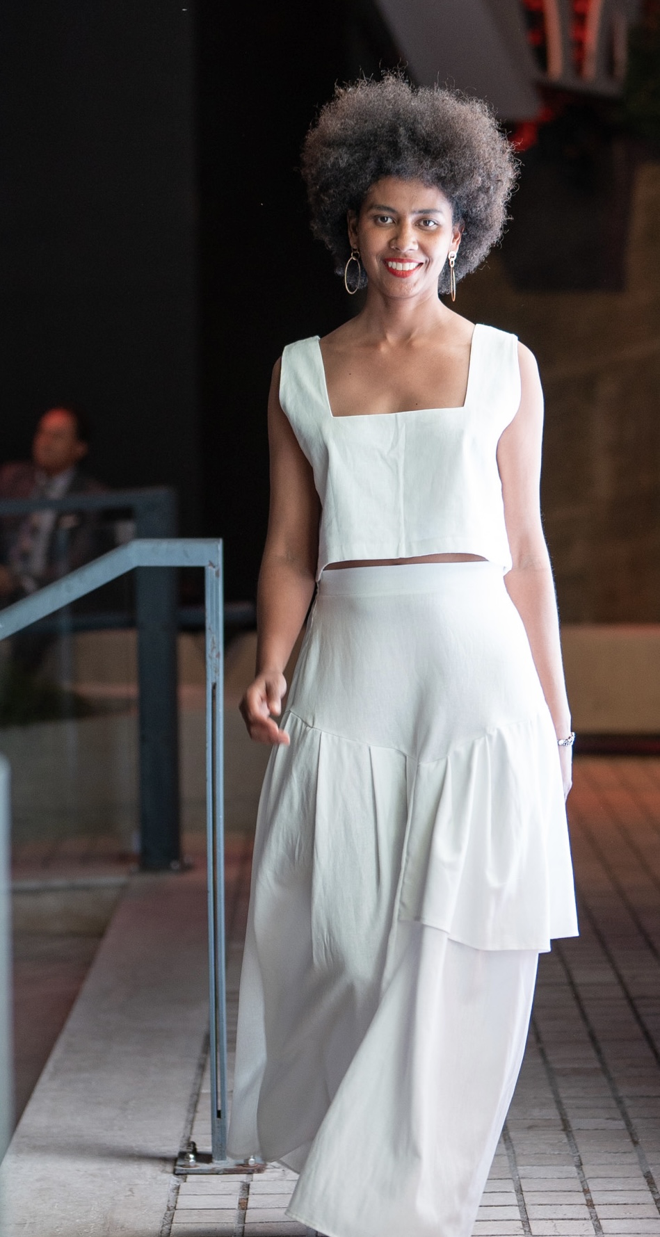Falda Maria confeccionada en lino, es una falda larga a la cintura con un vuelo sobre la rodilla.