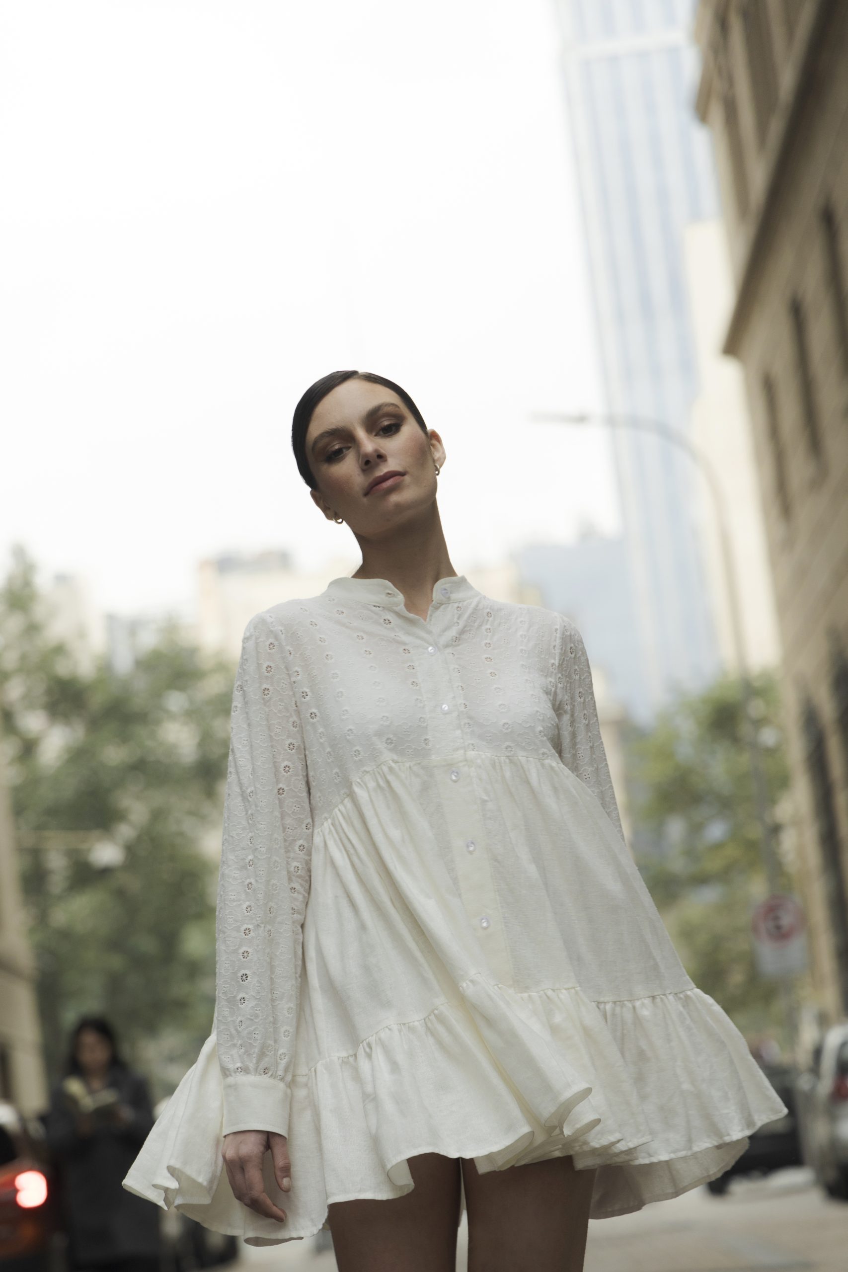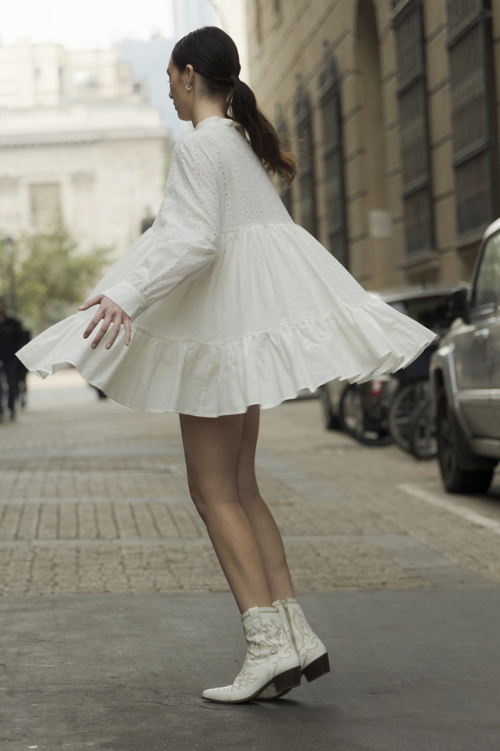 Es un vestido corto camisero de Lino color crudo con cuello mao y con detalles en broderie en mangas y pecho en mismo color, con una muy amplia falda y vuelo en la parte más baja,