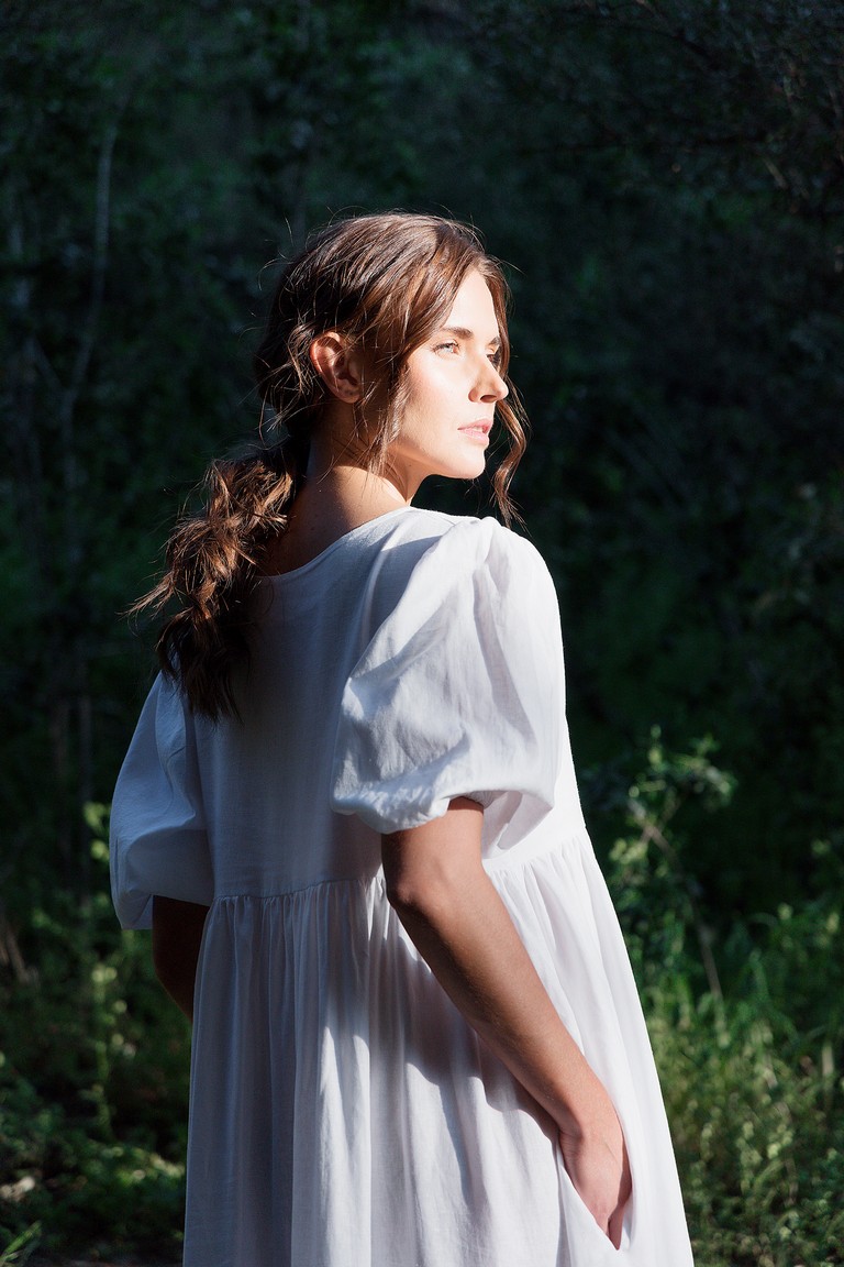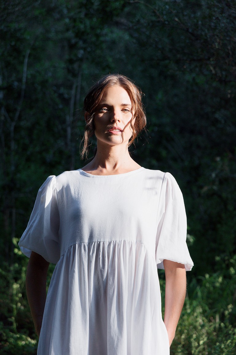 Vestido de Lino Largo con una caída fluida y oversize. Con mangas tipo globo y bolsillos en ambos costados del vestido. En honor a Vesta el Rayo Gemelo de Helios.
